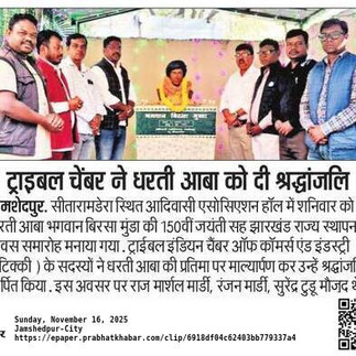 शनिवार को धरती आबा भगवान बिरसा मुंडा की 150वीं जयंती एवं झारखंड राज्य स्थापना दिवस भी श्रद्धा और उत्साह के साथ मनाया गया। TICCI के सदस्यों ने धरती आबा की प्रतिमा पर माल्यार्पण कर श्रद्धांजलि अर्पित की और उनके संघर्ष, बलिदान तथा अदम्य साहस को याद किया।